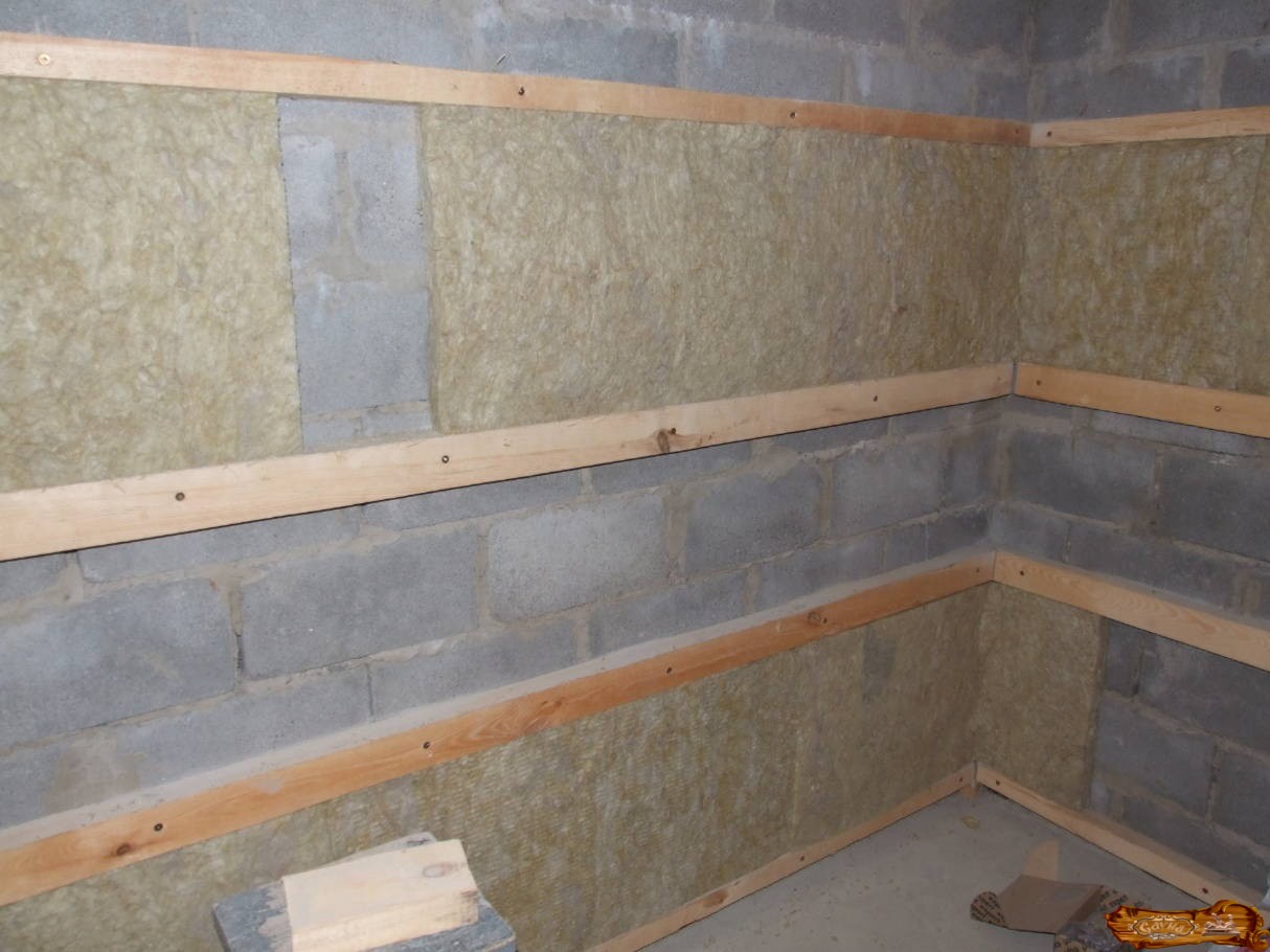 Нанесение деревянной обрешетки на поверхность стены. Важно, чтобы междуреечный промежуток был меньше ширины теплоизолятора. В качестве теплоизоляционного материала можно выбрать минвату или базальтовое волокно.