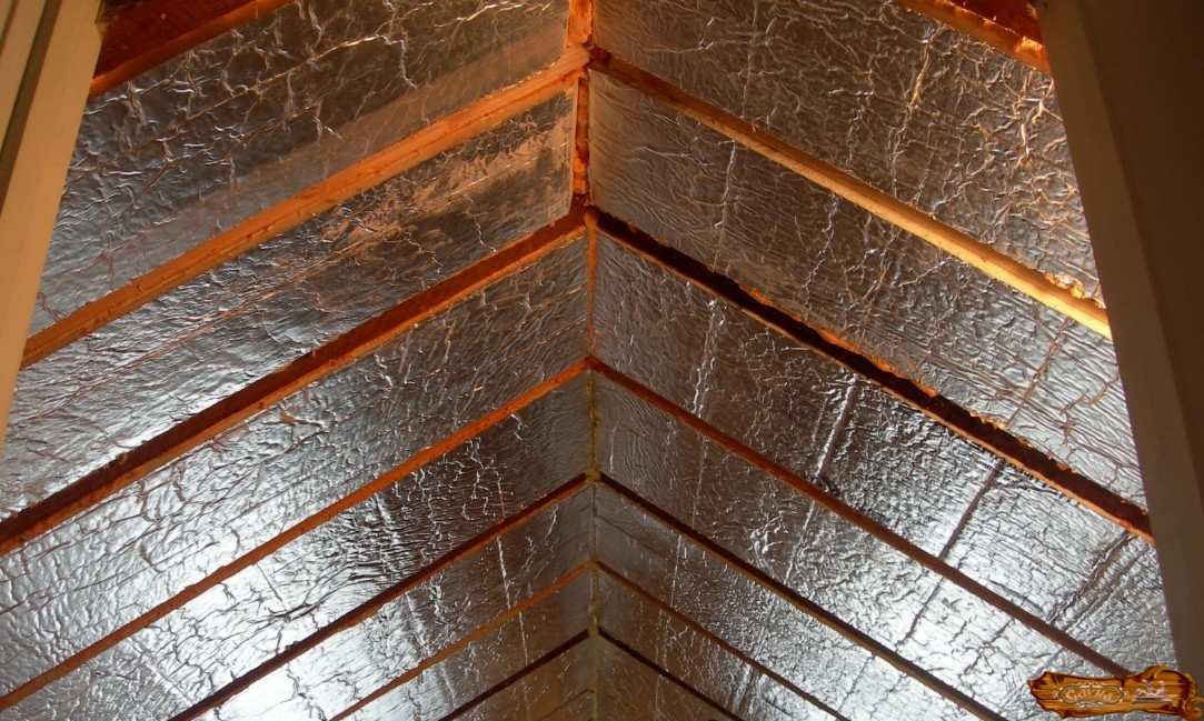 Чтобы утеплить потолки саун или бань, целесообразно использовать светоотражающие материалы с алюминиевой фольгой. Благодаря специализированному покрытию они препятствуют «утечке» инфракрасных лучей. Обычно фольгированный или отражающий утеплитель изготавливается из вспененного полипропилена. На одну из его сторон установлен отполированный алюминий или металлизированный лавсан.