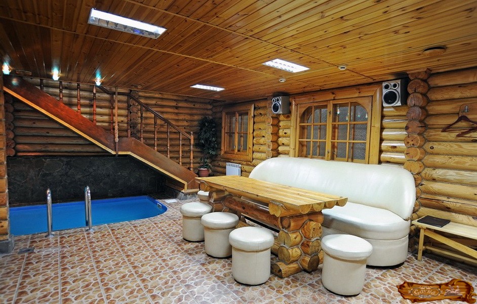 Комната отдыха может располагаться рядом с предбанником в виде пристройки по типу террасы или беседки на свежем воздухе. Если на участке построена большая двухэтажная баня, то под комнату отдыха обычно выделяется одно или несколько помещений на втором этаже с бильярдом или удобной мебелью и большим телевизором.