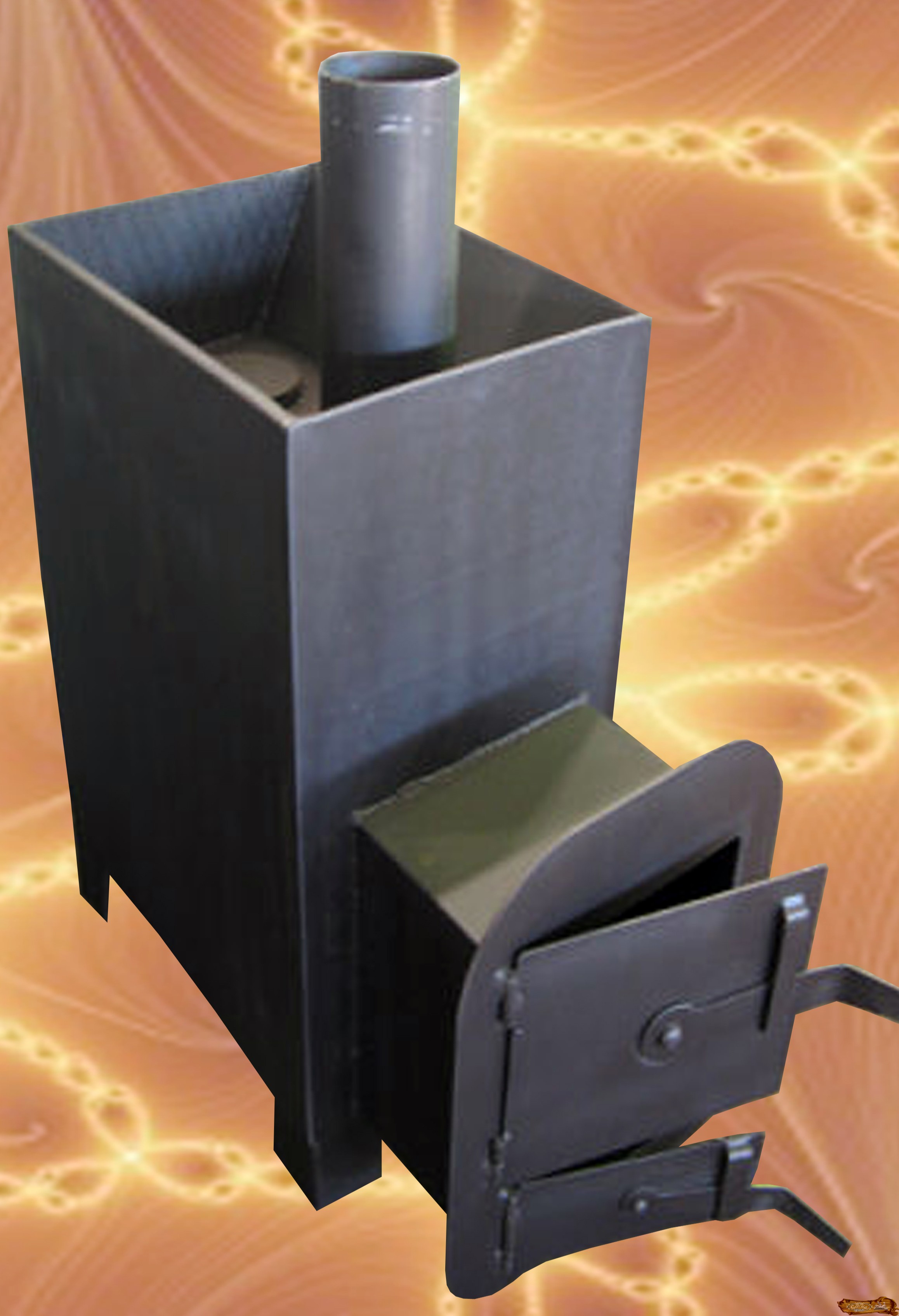 Печь для бани в форме сапога, также на ваше усмотрение может иметь нужные вам размеры как самой печи, так и её секций. Проект данной печки выполняется с помощью сварки деталей, вырезанных из железа листового (толщиной от 5 до 10 мм), водяным баком из нержавейки и каменкой, расположенной внутри дымохода.