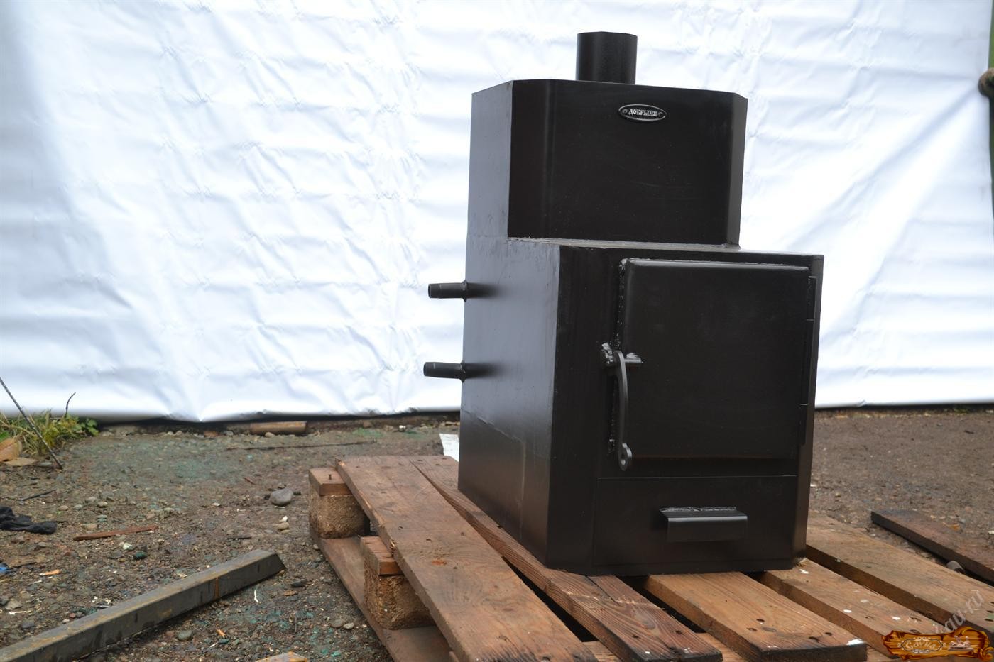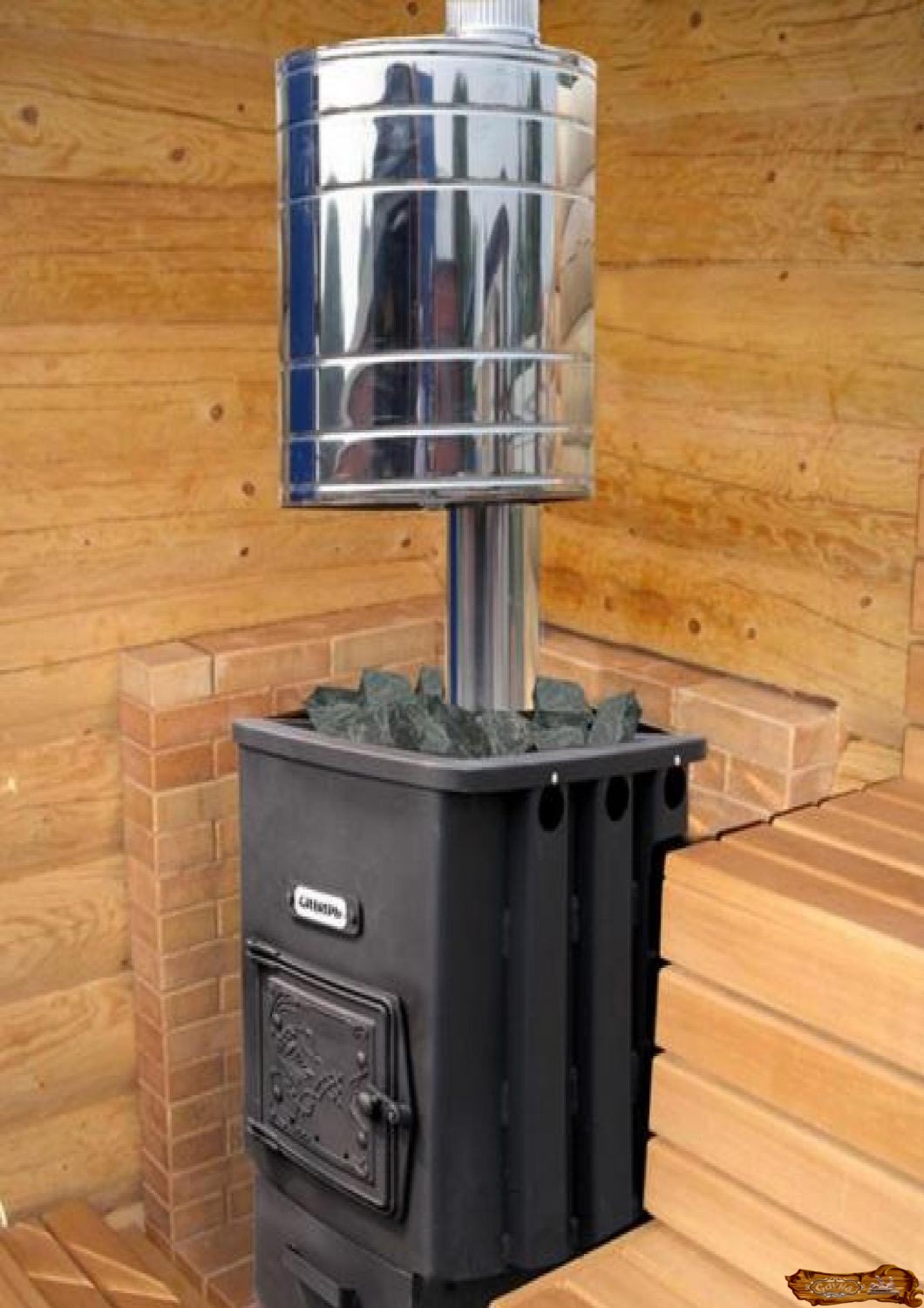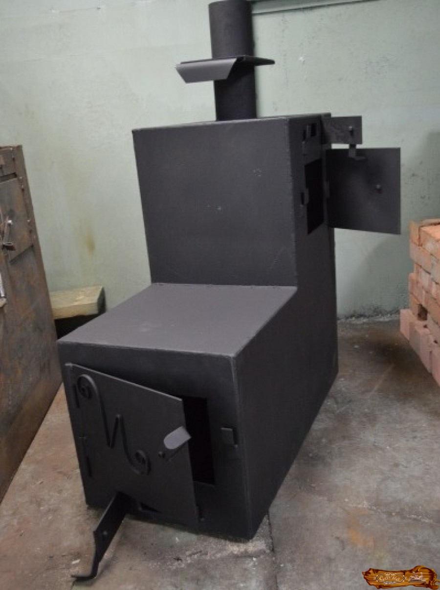 в форме сапога, изготовленного из листового железа с каменкой, расположенной в дымоходе, и водяным баком из нержавейки.