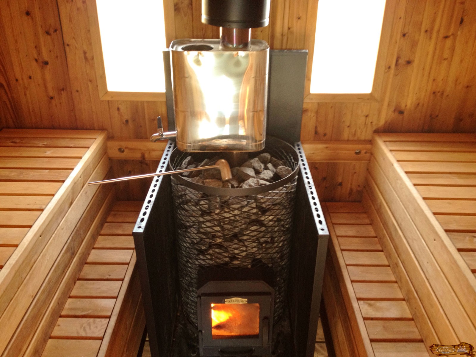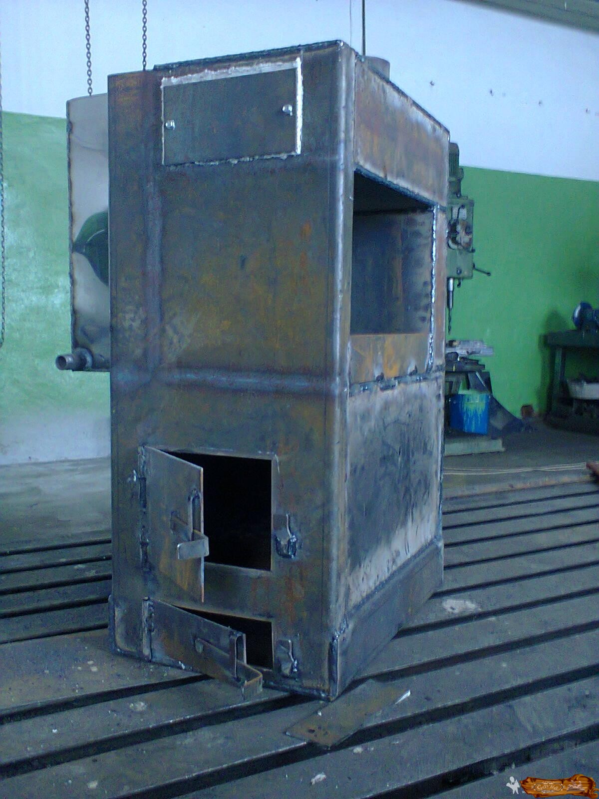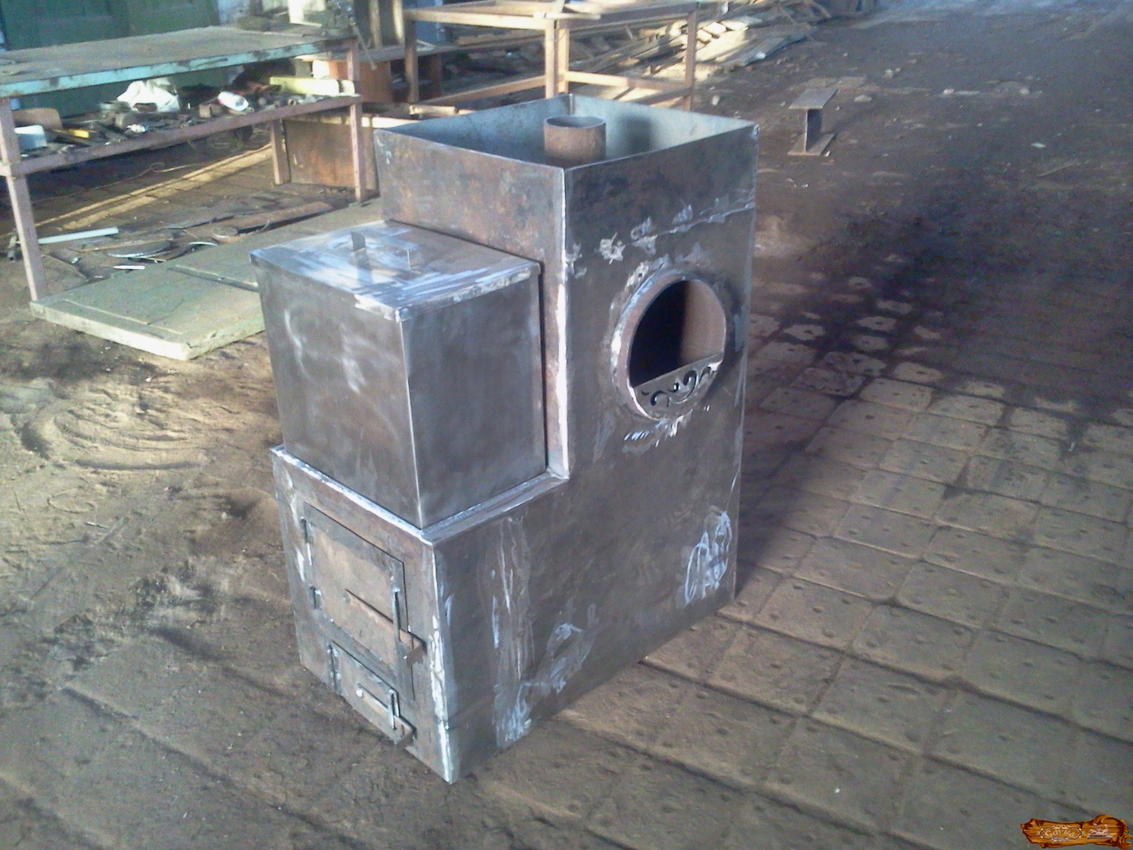 в форме сапога, изготовленного из листового железа с каменкой, расположенной в дымоходе, и водяным баком из нержавейки.