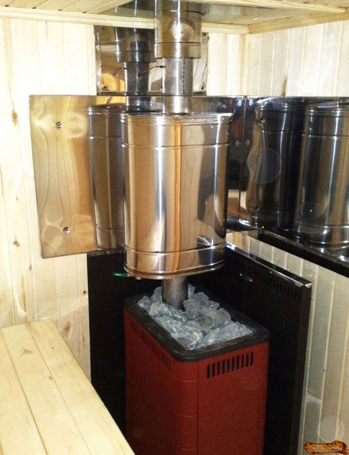 Теплообменник, выполненный из стали нержавеющей с врезанными вставками для подсоединения шлангов или трубок с помощью хомутов: Внутренняя отделка бани обычно состоит из деревянных элементов, а печь прогревается до высоких температур. Чтобы обеспечить безопасность людей, находящихся в парилке, от ожогов и предотвратить возгорание, печь надо прикрыть.