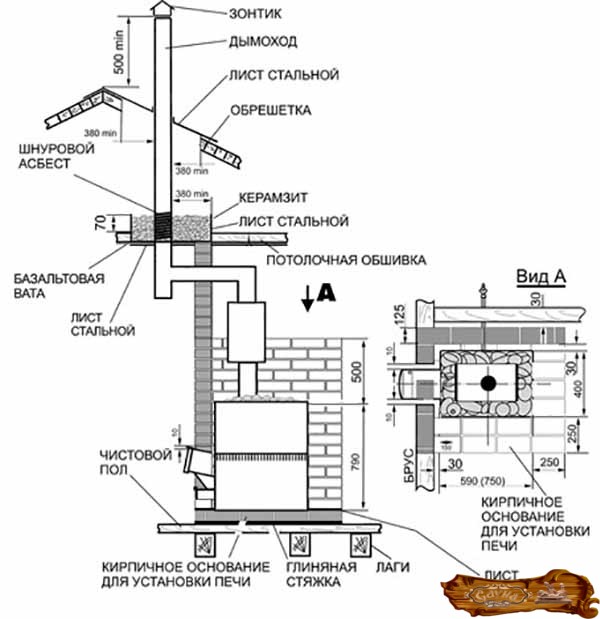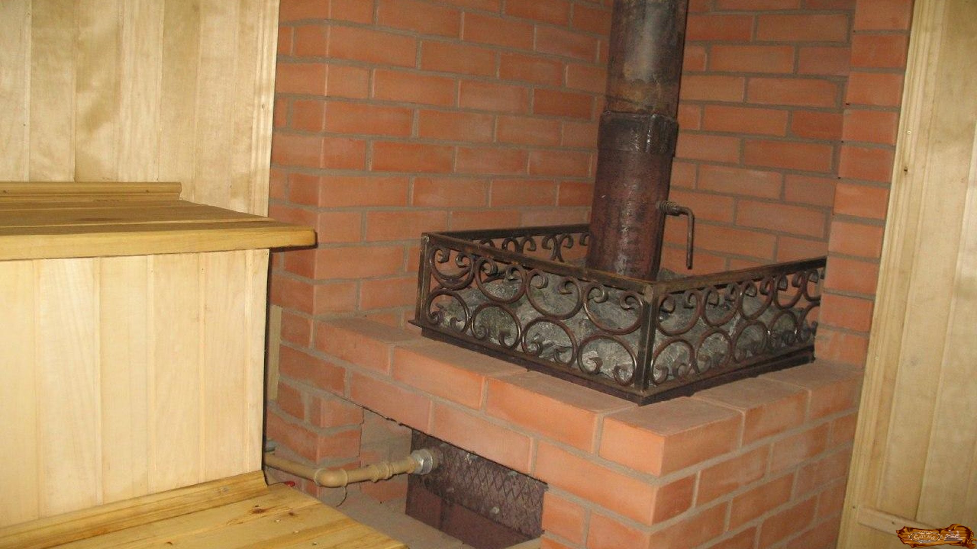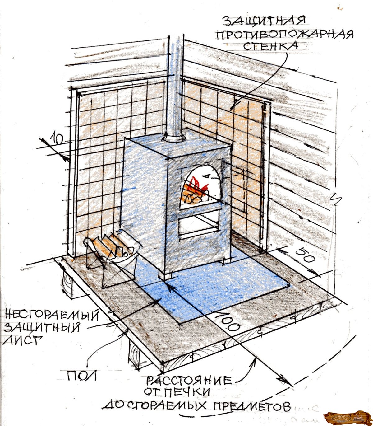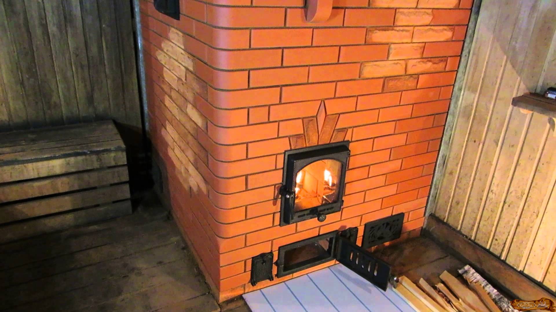 Для исключения возгорания печь ставят не ближе одного метра от стен и легко возгорающихся предметов. Стены вокруг печи штукатурят, обкладывают кирпичом, обшивают листами железа или минорита, отделяют место хранения дров. Если топка вынесена из парилки, проем также защищается от возгорания негорючими материалами.