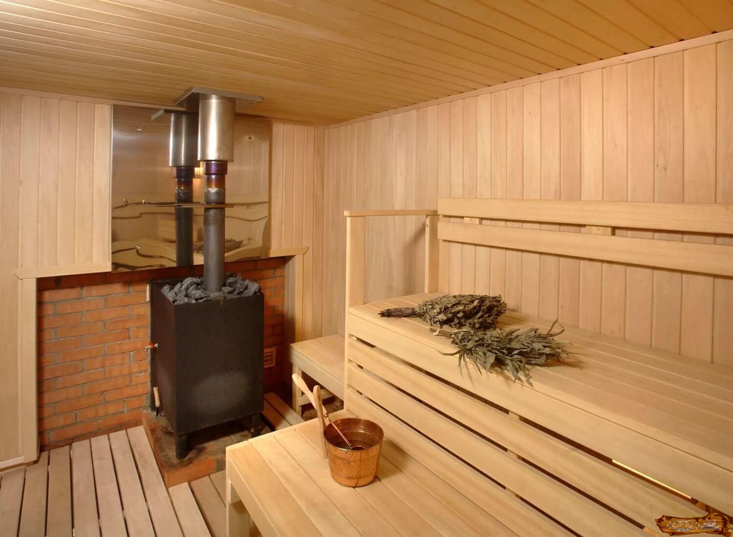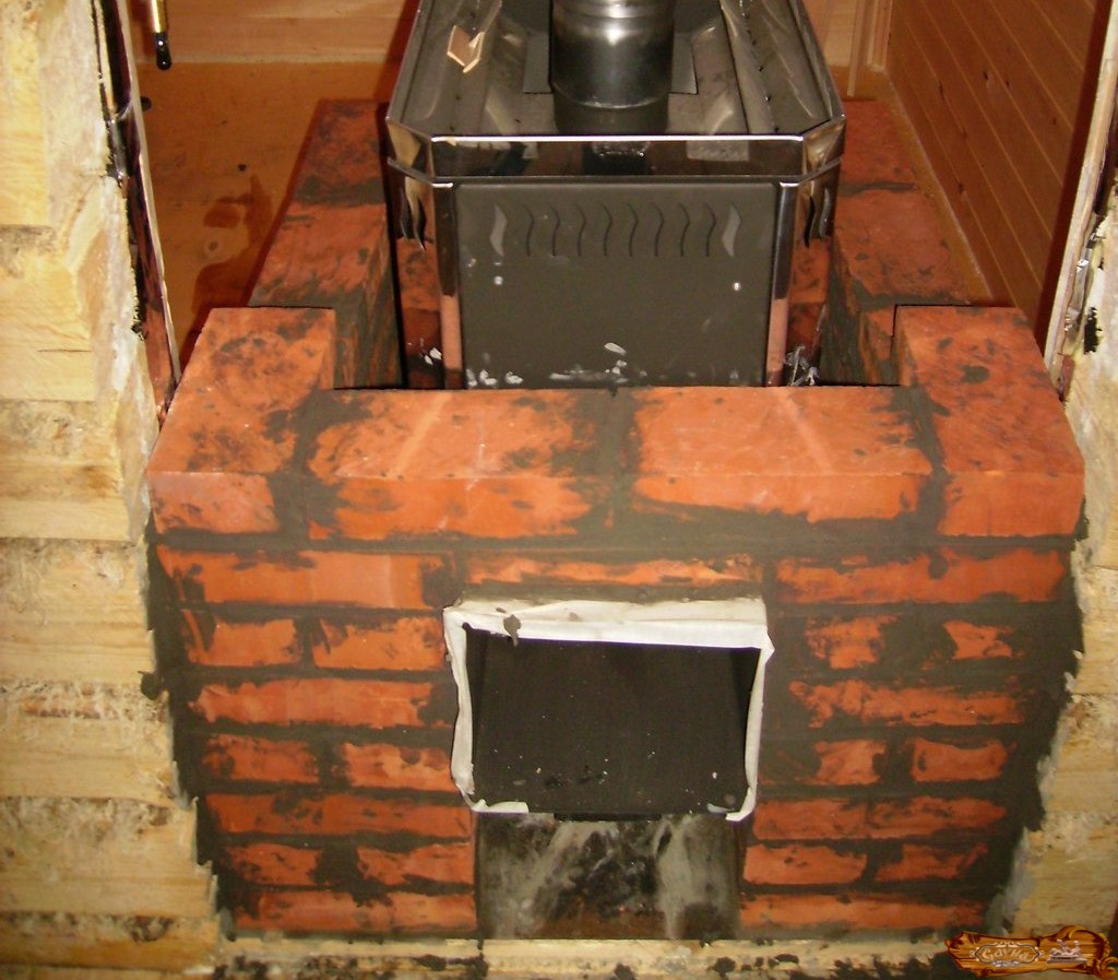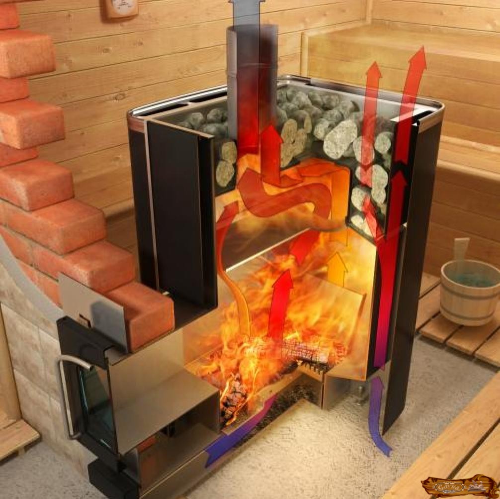 Большие ценители русской бани понимают, что трудно натопив каменку до создания легкого пара, сохранить температуру в помещении не более 70 градусов. Добиться нужного эффекта, исключив температурный перегрев парной можно, облицевав металлическую печь жаропрочным материалом. Стены в такой печи прогреваются не сильно, основной жар идет на обогрев наполнителя каменки, но эта конструкция несет в себе повышенную пожарную опасность из-за высокой температуры в дымоходе. Уменьшить эту опасность можно, устроив вокруг дымохода каменку и (или) бак для воды. Снаружи обложить печь проще, но тогда быстро прогорают металлические стенки. Замедлить этот процесс можно, используя более толстый металл или оставив зазор между облицовкой и металлической печью.