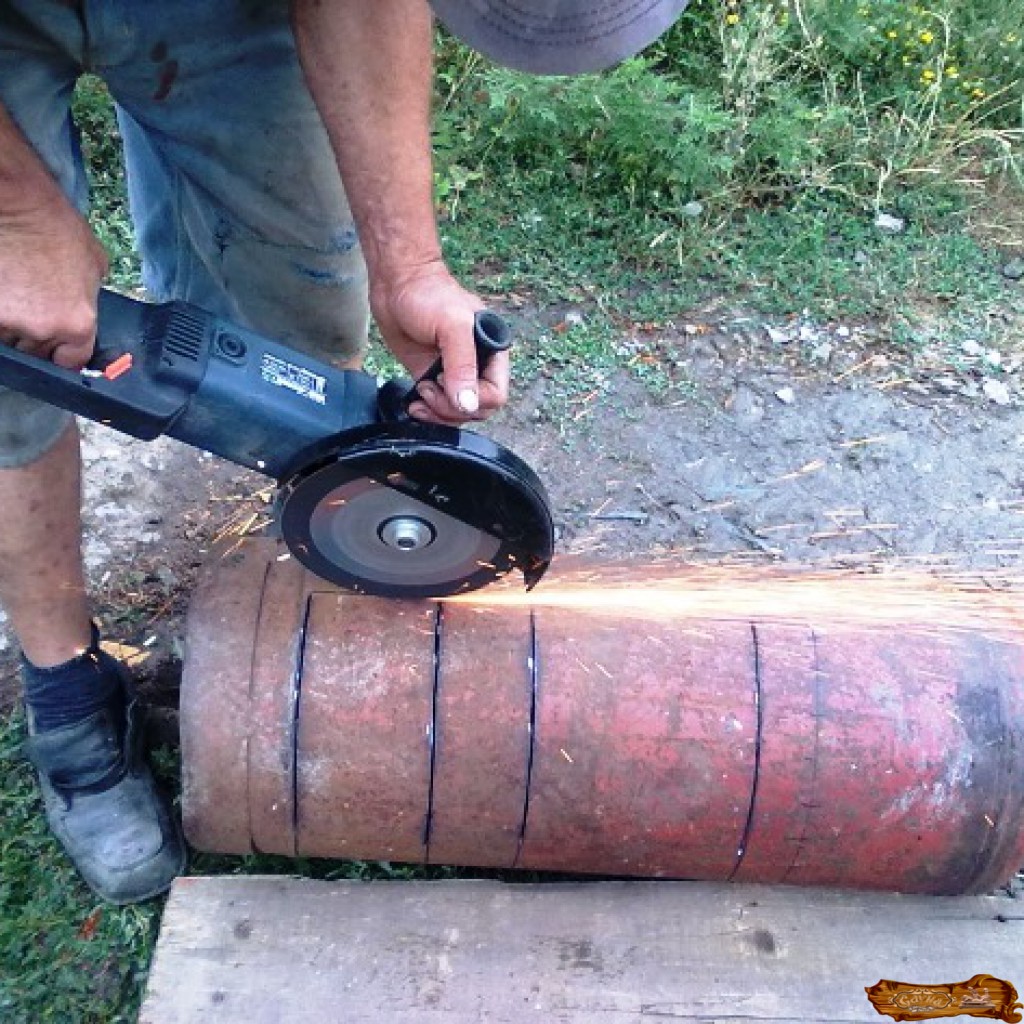 отрезаем болгаркой верхнюю часть баллона по шву;