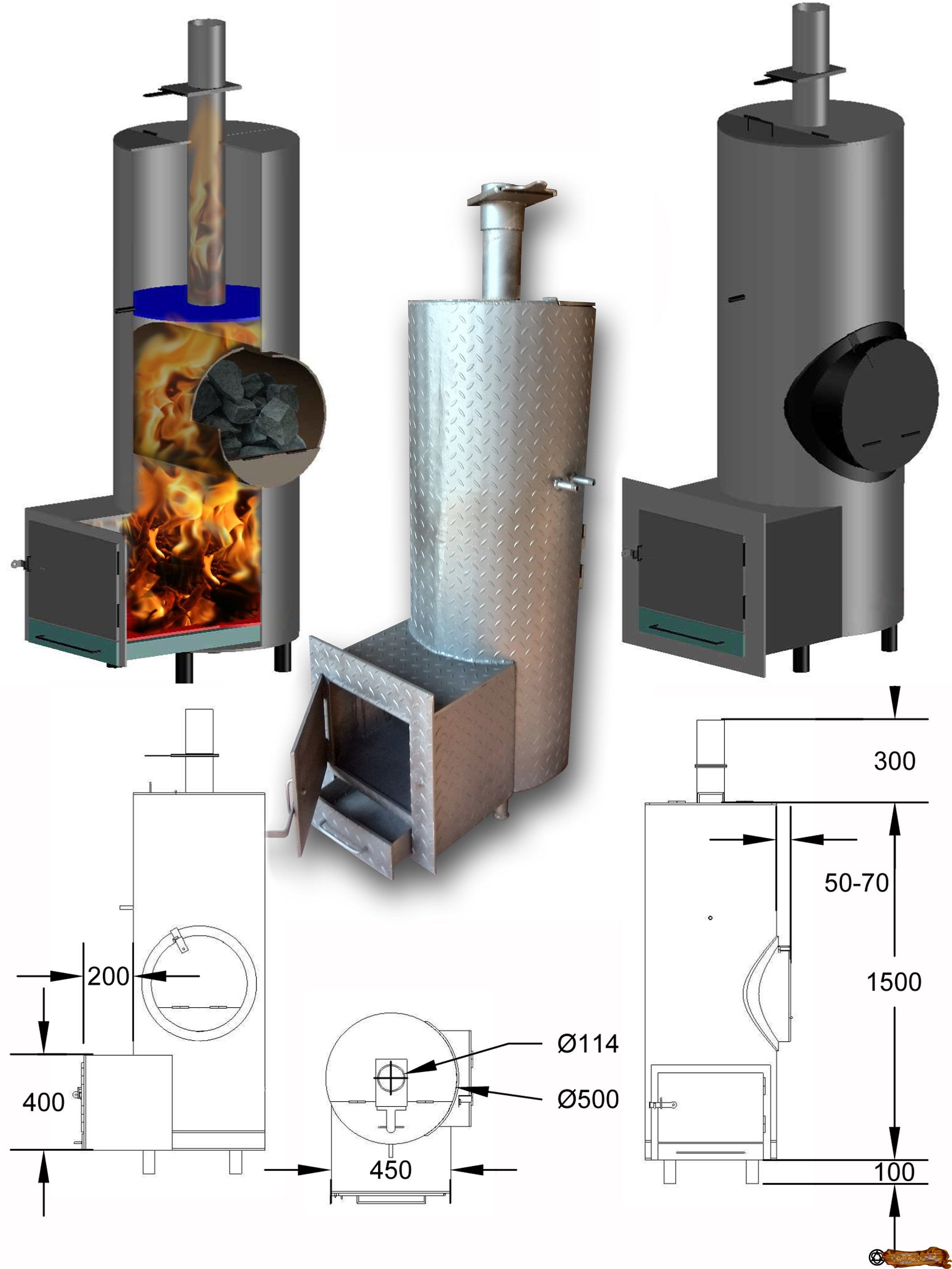 Чертежи металлической печки с корпусом, сделанным из 530 мм трубы, дверца топки расположена в смежной комнате: