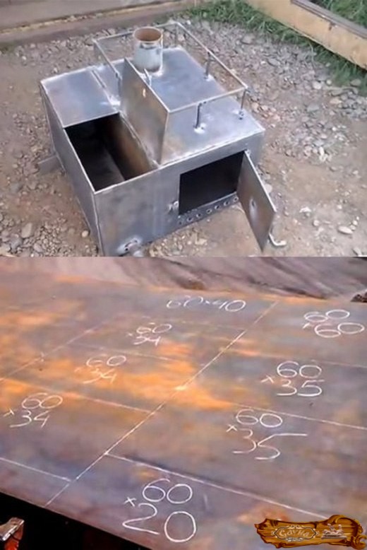 Изготовление металлической печки с дверцей топки, расположенной в смежной комнате, начинается с нарезки металлических элементов согласно ранее представленному чертежу: