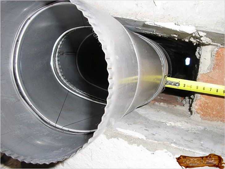 Проем в потолочном перекрытии проделывают так, чтобы оставить зазор более 30 см от трубы до ближайших деревянных потолочных конструкций с каждой стороны.