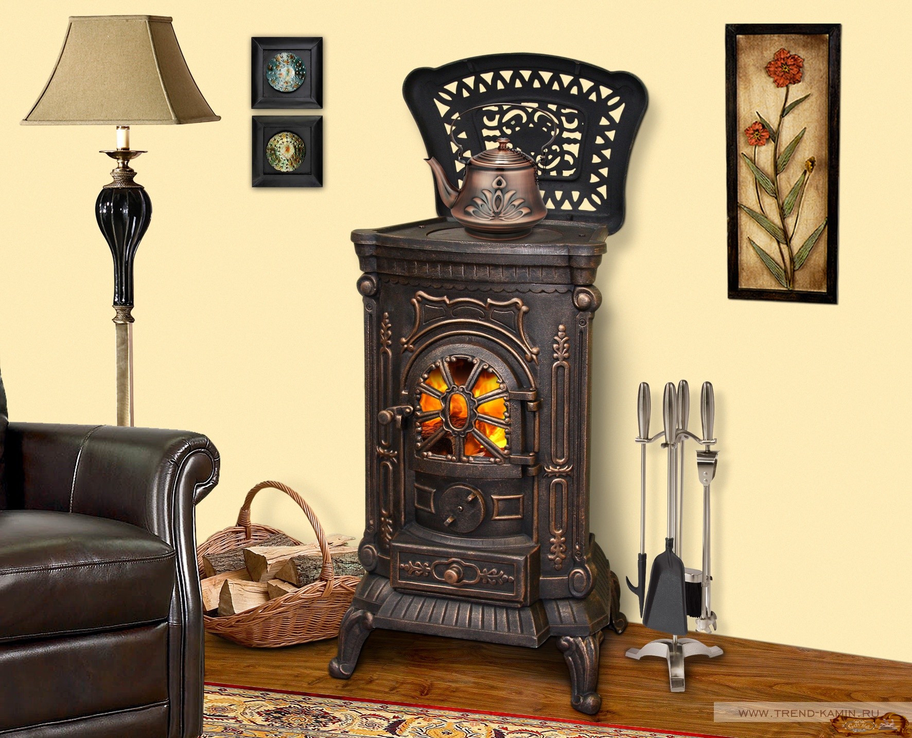 Такие камины часто имеют исполнение в ретро-стиле, что позволяет им гармонично смотреться в аналогичных интерьерах, а также помещениях в «деревенском» стиле.