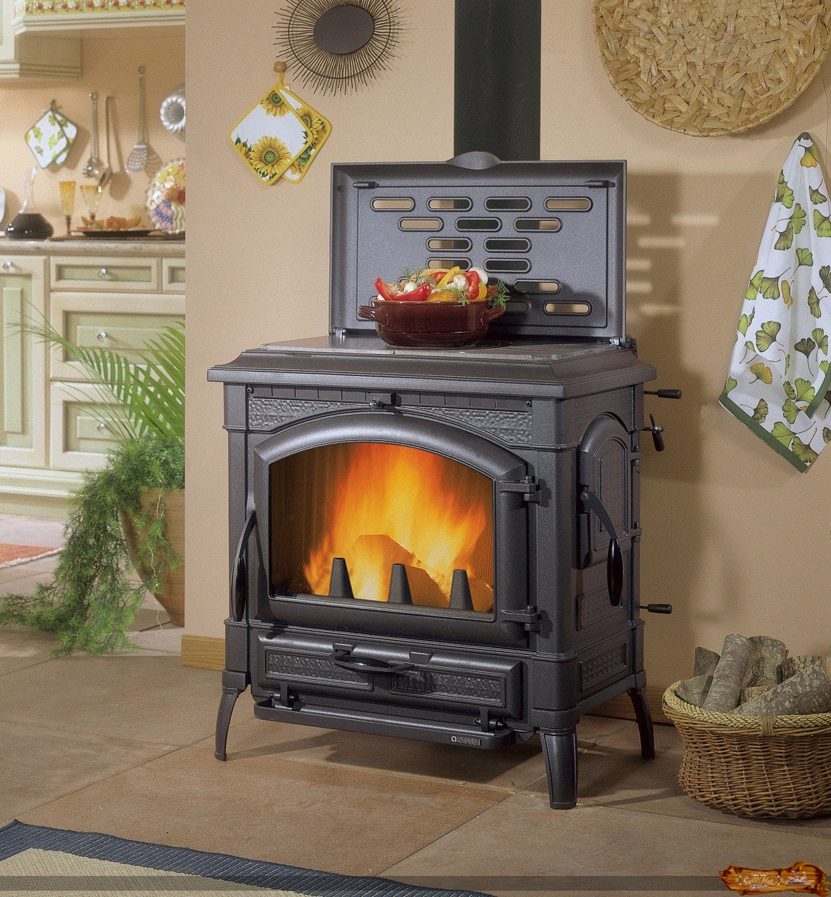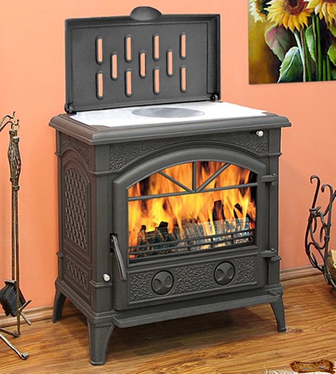 Устройство можно смело отнести к разряду «smart», поскольку оно имеет режим экономии дров, специальный режим очистки стекол. Практичность и полифункциональность также являются преимуществом модели. Она оснащена варочной плиткой, поэтому не только обогревает и украшает помещение, но и служит для приготовления пищи.