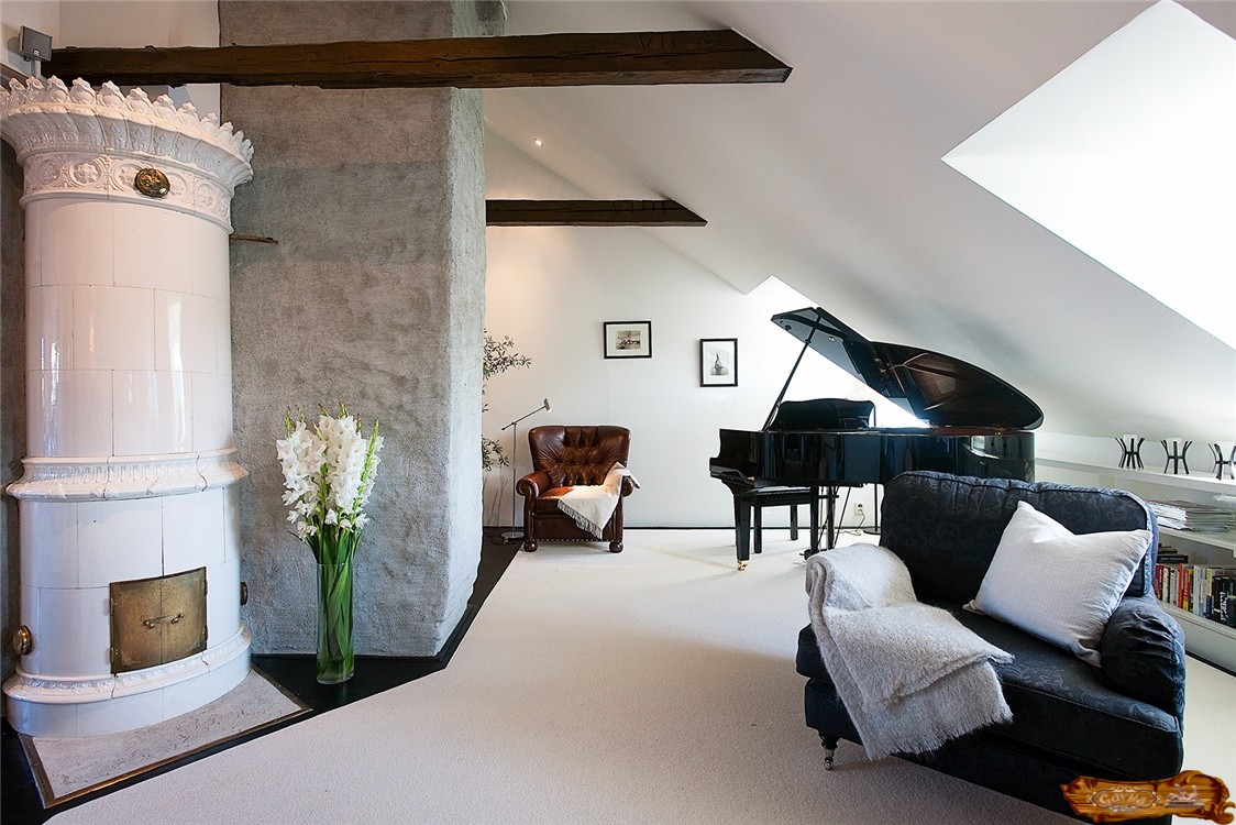 Комната может иметь и современное оформление, тогда печь отличается лаконичным дизайном, наличием большой стеклянной дверцы. Стальные ручки и прочие блестящие поверхности делают возможным «вписать» конструкцию в хай-тек интерьеры.