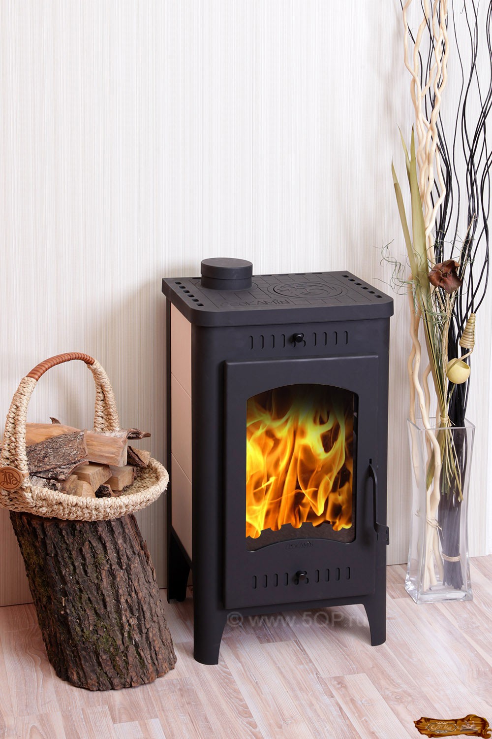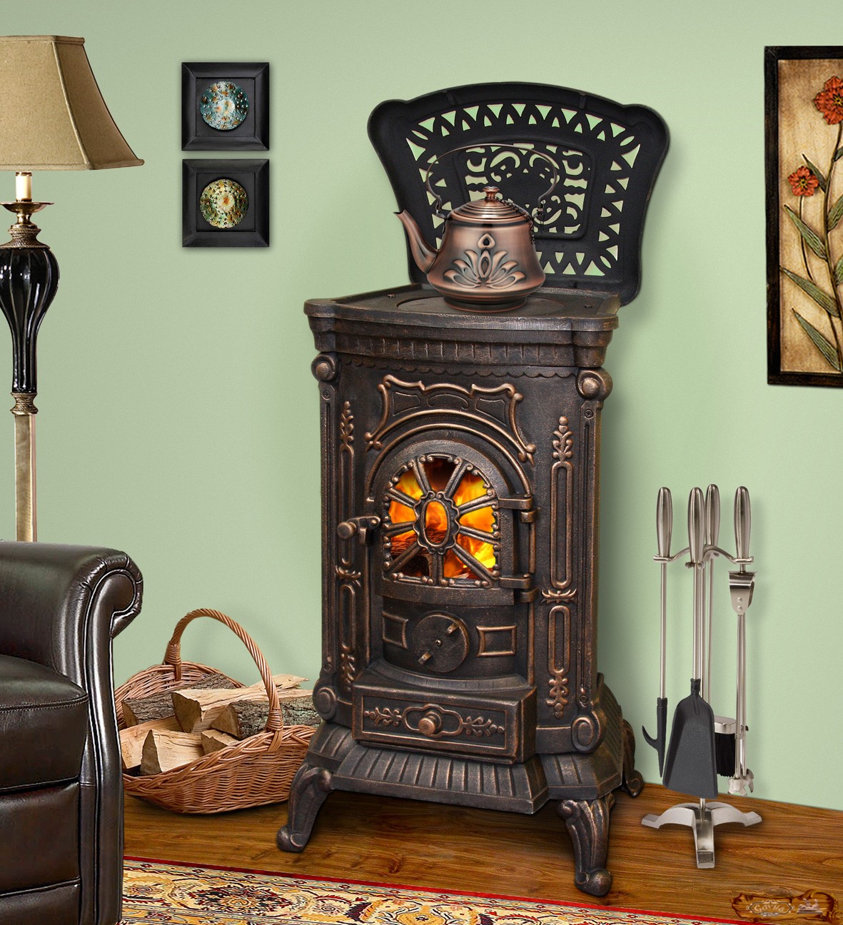 Интерес представляет также печь «Crown JA010» от одноименного китайского производителя. Главная ее особенность – мобильность, возможность при необходимости перенести печь на другое место. Это изделие имеет еще меньшие размеры по сравнению с польскими аналогами. Параметры китайской печи – 438-387-627 мм, мощность – 6 кВт. Дизайн вновь выполнен в ретро стиле. Устройство имеет гнутые ножки, оригинальные узоры и стильную ручку дверцы топочной камеры. Средняя цена – 15 000 рублей.