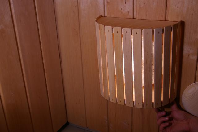 Если вы хотите, чтобы ваши светильники не только хорошо освещали помещение, но при этом были полностью безопасны, вписывались в интерьер и добавляли ему изюминку, украсьте их решетками. Сделать такую решетку можно самостоятельно, используя отходы от древесины, которой делали отделку стен помещения. Так вы получите действительно цельную и гармоничную картинку. Если же древесины не осталось или вы хотите добавить приятных леченых ароматов в парилке, тогда используйте доски лиственницы или кедра. Можно использовать древесину сосны, но только в том случае, если не будет даже случайного соприкосновения между решеткой и кожей отдыхающего.