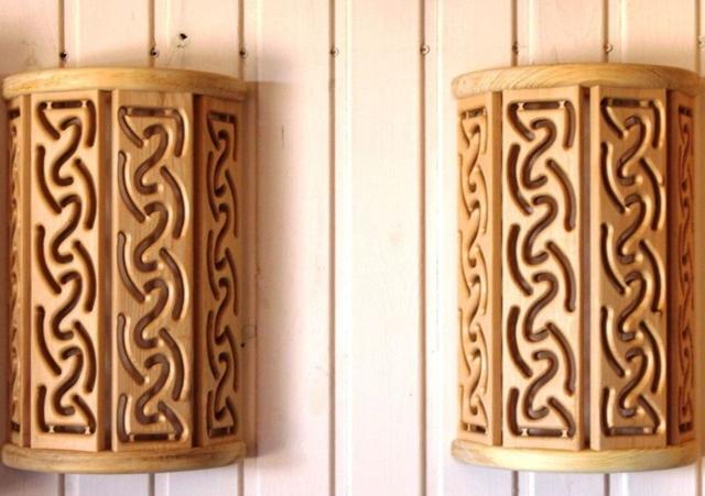 Даже обычные прямые рейки на решетке придают таинственность и мягкость обстановке в парной, но если вы умеете обращаться с инструментами, тогда вам по силам будет создать что-то более интересное и вычурное. Достаточно просто добавить углов, плавных линий или вырезать какую-либо фигурку в рейке, чтобы светильник для сауны и бань стал оригинальным украшением парной.