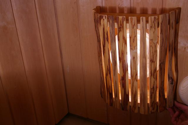 Для решетки вам понадобится несколько деревянных планок для каркаса конструкции и тонкие реечки для ее декорирования. Все детали необходимо отшлифовать, а соединять только с обратной стороны, чтобы отдыхающие даже случайно не соприкоснулись с металлом саморезов. Как вариант, детали решетки можно склеить между собой, но прочность в таком случае будет ниже и срок безремонтной эксплуатации вряд ли вас порадует. Саморезы для крепления – оптимальный вариант при создании решетки в сауну своими руками. На фото ниже еще один вариант оригинально абажура сделанного своими руками.