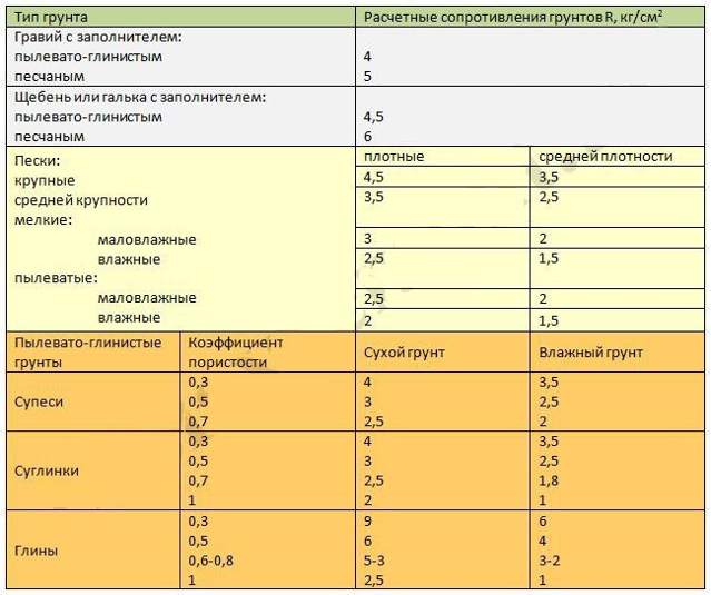 Показатель R – это расчетное сопротивление грунта. Это значение можно взять из данных таблицы.