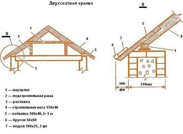 Крышу лучше всего делать двускатную с оптимальным углом наклона 20-23°. Это обеспечит схождение атмосферных осадков с ее поверхности. Стропила должны в нижней части крепиться к несущим стенам здания. А вверху образовывать конек кровли.