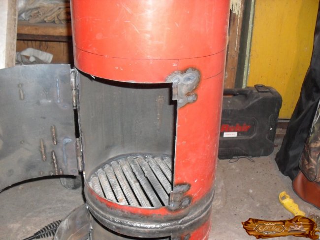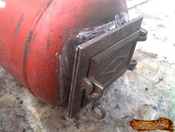 Далее изготавливается дверка – вырезается отверстие, к железной детали привариваются петли и все это крепится на корпус. Не страшно, если при закрытии остаются щели – они будут пропускать воздух, что поспособствует лучшему горению.