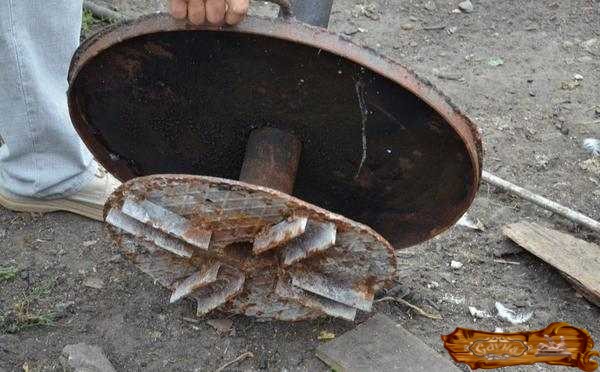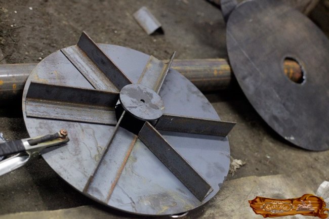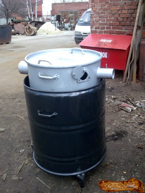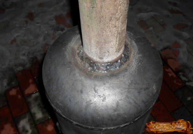 В верхней части крышки нужно сделать отверстие для трубы, а сбоку – вывод для дымохода. Далее внутренняя трубка приваривается к кругу и устанавливается вовнутрь, все детали крепятся друг к другу и надежно фиксируются.