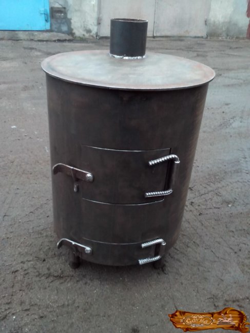 Данная модель должна быть цилиндрической формы и может иметь исключительно вертикальное расположение. Поэтому для ее изготовления подойдут как баллоны и широкие железные трубы, так и стандартные бочки из металла.