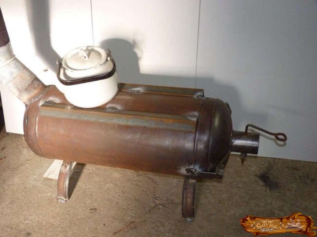 Другой вариант расположения самодельной железной буржуйки – горизонтальное положение. Как уже было сказано, минус такой конструкции заключается в громоздкости, ведь она занимает довольно большое пространство на полу, поэтому горизонтальный вариант категорически не подходит для маленьких гаражных помещений.