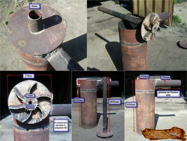 Для начала нужно выбрать деталь цилиндрической формы, подходящую по размерам и параметрам. Затем необходимо основную часть разделить на две, отличные друг от друга размером. Нижний, более узкий элемент, будет предназначаться для золы, а верхнее пространство – для растопки при помощи дров.