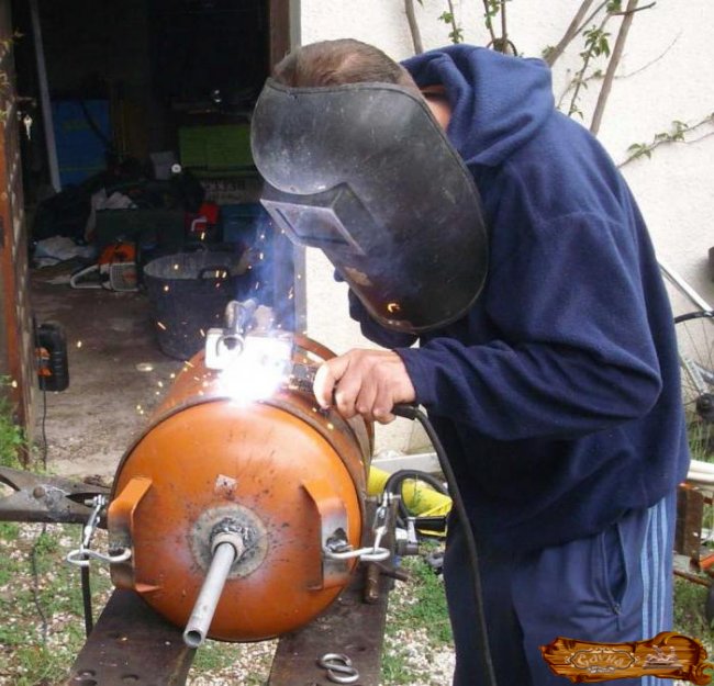Наружная бочка является исключительно корпусом, а вот внутренняя служит для растопки. В бочках также должны быть все необходимые отверстия, ящик для золы и дымоход. Чтобы соорудить дверцу, нужно будет закрыть промежуток между двумя деталями при помощи сварки и металла, дабы предотвратить высыпание песчано-галечного наполнителя.