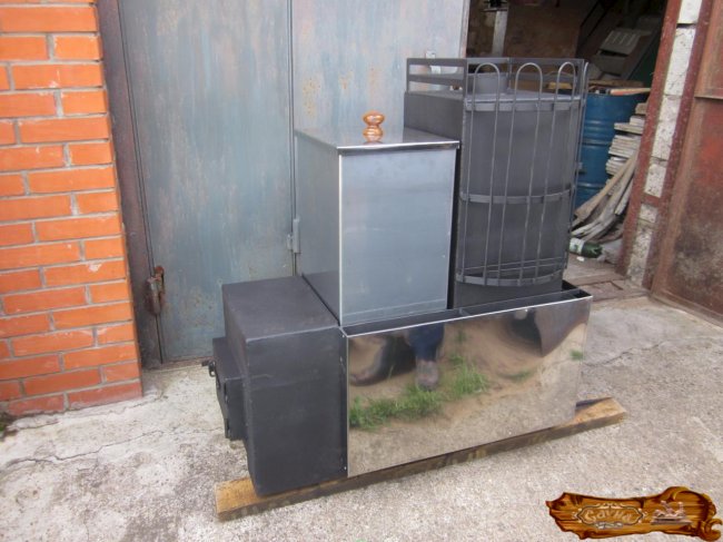 К задней части с пазом приваривается глухая стенка, к фронтальной части, в свою очередь, прикрепляется заглушка с подвижной дверкой в форме полукруга, которая впоследствии будет использоваться в качестве вместилища для камней и добавления жидкости на камни в процессе парения в бане.