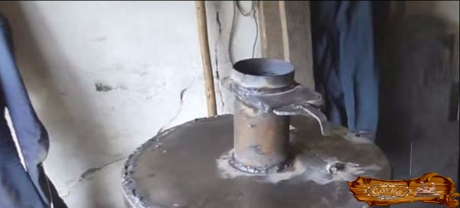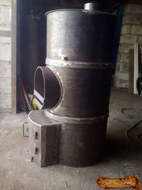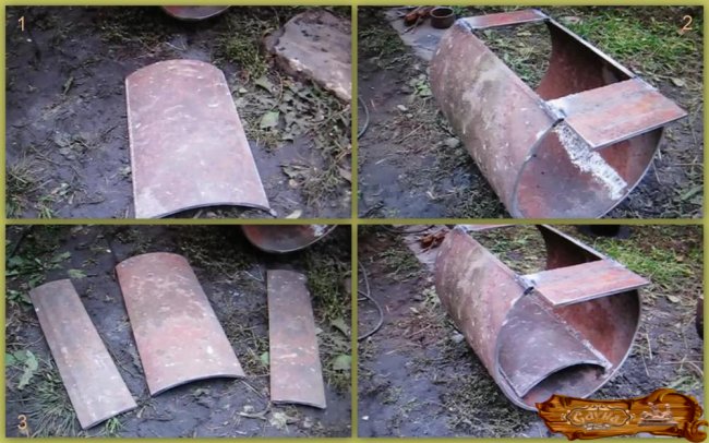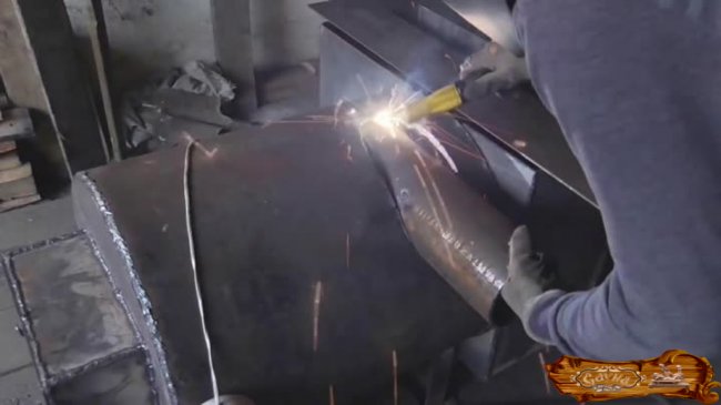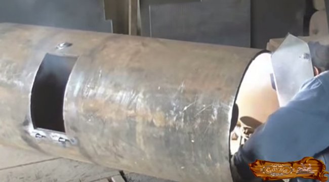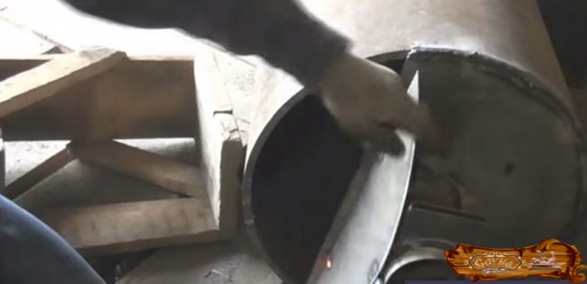Следующий шаг – изготовление чана для воды, при этом дымоходная труба должна проходить как раз через него. В качестве боковых стенок используется основная труба, дно одновременно является верхним сводом топливника.