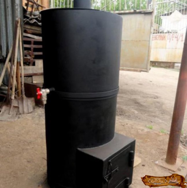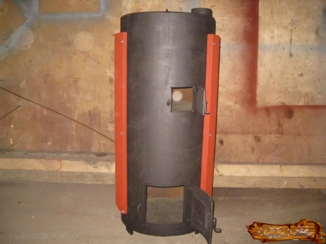Вертикальная печь внешне похожа на печку-буржуйку, однако имеет отличия – дополнительное вместилище для камней и емкость для воды.