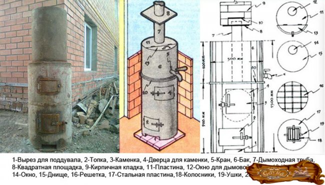 Среди любителей отдыха на природе или поклонников здорового образа жизни вряд ли найдется кто-то, кто не любит попариться в бане. Сегодня многие дачники стремятся обзавестись собственной банькой. В последнее время набирает обороты самостоятельное создание банной печи из баллона или трубы. Строительство основательной печи из кирпича требует определенных навыков и умений, помимо прочего, такая печь занимает больше места, а купить ее можно в строительном магазине, но это стоит определенной суммы денег. В то время как печь из металла – более экономичный вариант и ее значительно проще сделать самостоятельно, не говоря уж о том, что можно доверить эту работу сварщику. Печь, сделанная самостоятельно с учетом техники безопасности, не несет в себе угрозы для жизни и здоровья человека, поскольку ее герметичный корпус не выделяет при работе угарный газ. Особенности: плюсы и минусы Исходным материалом для металлической банной печки может служить не только труба или баллон, в ней используется и листовая сталь. Из листов обычно делают корпус в виде прямоугольного параллелепипеда, однако у такой формы есть свои особенности: листы необходимо предварительно раскроить, разрезать и соединить вместе сварочным аппаратом; как следствие, такая печь будет стоить дороже; топливник цилиндрической формы лучше проводит тепло; исходя из траектории движения дымовых газов круглое сечение более предпочтительно; плоские стенки больше подвержены прогоранию, нежели трубы из точно такого же материала. В чем плюсы именно металлических печей: цилиндр лишь немного проигрывает сферической форме по теплопроводности; толщина стен водопроводных или газовых труб дает возможность достигнуть высоких показателей теплопроводности; печь можно перемещать, она долговечна; стоимость изготовления такой печи весьма невысока, поскольку обрезки труб часто продают по низким ценам; подробная инструкция по изготовлению с указанием размеров и диаметров труб позволит снизить трудоемкость процесса и сэкономить время; многие заводские изделия подобного рода делаются из точно таких же труб, по образу и подобию которых легко воссоздать изделие кустарным способом; помимо этого, такие приспособления обладают жаропрочностью, устойчивы к коррозии, долговечны и легко переносят перепады температур. Разумеется, такие печи имеют свои недостатки – обработка толстой металлической трубы требует как приложения физической силы, так и инструментария для определенного типа работы. Виды и характеристики По расположению в пространстве печи, изготовленные из трубы, делятся на следующие виды: вертикальные; горизонтальные. Вертикальная печь внешне похожа на печку-буржуйку, однако имеет отличия – дополнительное вместилище для камней и емкость для воды. Вертикальная самодельная печь занимает меньше пространства, что имеет большое значение при небольших габаритах парной, однако по той же причине она уступает горизонтальной печи по времени горения и интенсивности теплообмена. В процессе горения топлива тепло уходит вверх, боковые стенки не успевают сильно прогреться. В горизонтальной печи процесс идет иначе – поскольку прогретый воздух по пути к дымоходу попутно нагревает и свод корпуса. Исходя из этого ясно, что КПД горизонтальной печи будет выше, чем вертикальной. Главным нед