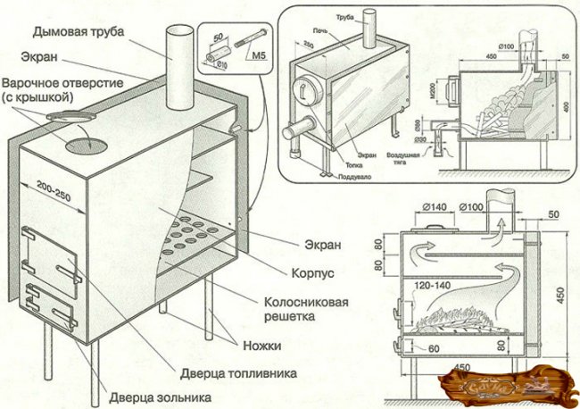 В случае, если это первый опыт самостоятельного изготовления печки, логичнее обратиться к уже готовым чертежам и схемам по изготовлению типовой модели устройства, это поможет избежать ошибок и дальнейшего некорректного функционирования агрегата. Более того – неправильно собранная печь может угрожать жизни и здоровью человека!