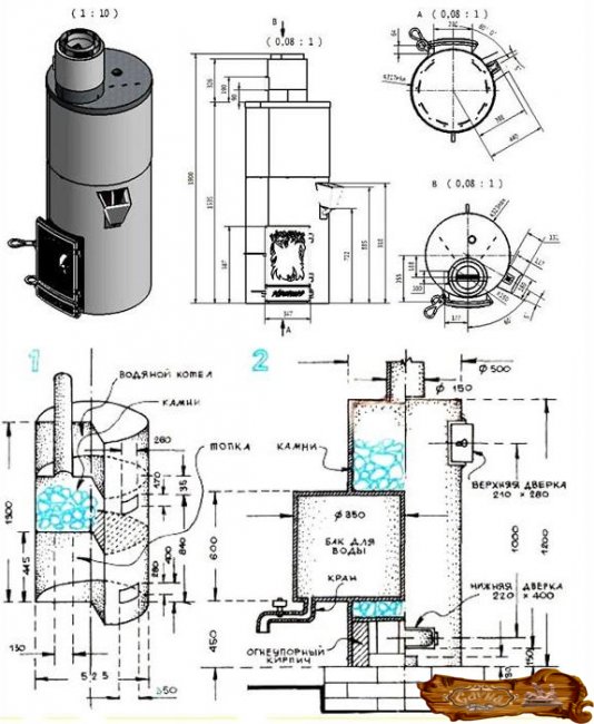 Не обладая должным опытом, лучше всего отдать предпочтение печи с вертикальным расположением – в ней каменка и чан для воды подогреваются последовательно. Более опытным людям лучше сделать печь параллельной схемы, вода в таком случае греется быстрее. Самой сложной для изготовления считается колпаковая печь, каменка в которой также является открытой.