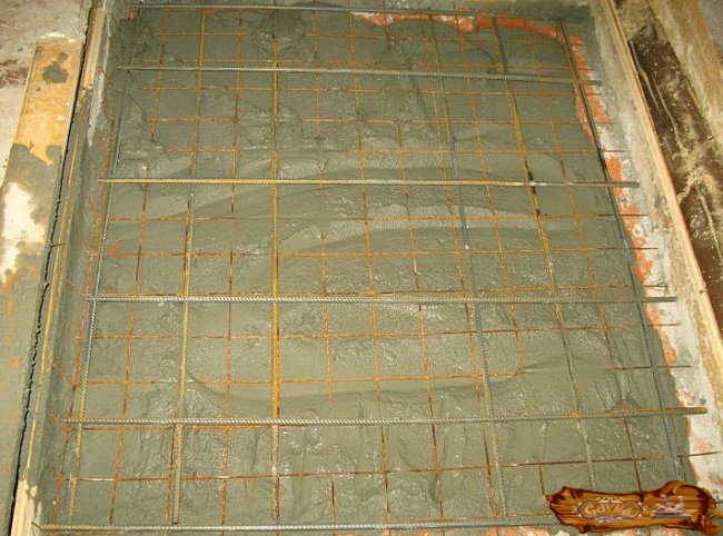 Слой рубероида финально заливается бетонным составом: где на 1 часть цементной смеси приходится 2 части песка, 4-5 частей гравия и вода. После этого необходимо разровнять получившийся слой.