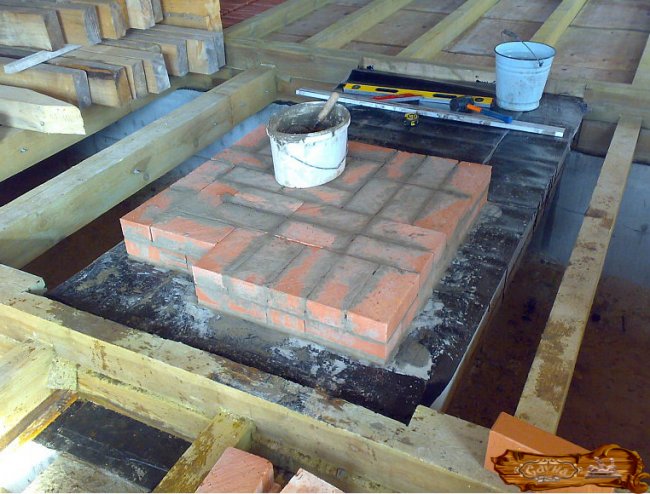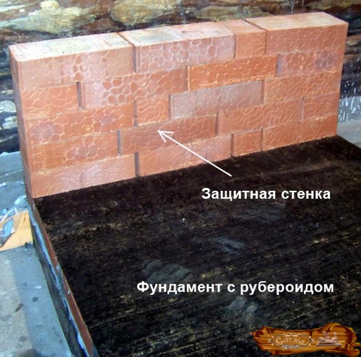 После засыхания фундамента оборудуется глиняная площадка, на которую впоследствии укладываются кирпичи по тем же размерам – 0,7 м на 0,7 м. В итоге кирпичная площадка должна составить в высоту порядка 15-20 см. С целью защиты стен от перегрева в месте, предназначенном для расположения печи, выкладывается защитный экран из кирпичей, которые укладываются ребром и скрепляются при помощи глиняного состава. Наилучшая длина для данного сооружения – 120 см, при этом печь располагается не менее чем в 20 см от него.