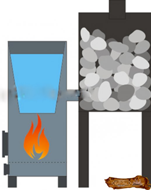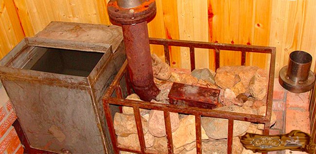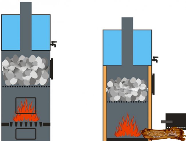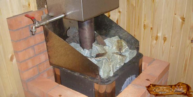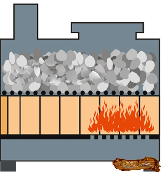 Простейший тип открытой каменки – это лоток, установленный на топку. Такое приспособление подойдет только для горизонтального вида печки. Но есть свои сложности – проведение предварительных расчетов, а также исследование прототипов, поскольку должна быть точно соблюдена площадь контакта между камнями и стенками топки. Меньшей точности требует иной тип каменки, в котором подогрев происходит посредством дымовых газов, но такое устройство и сложнее сделать.