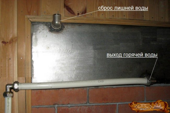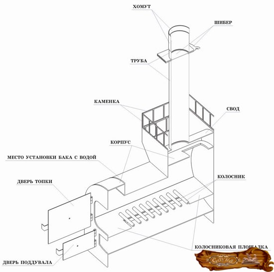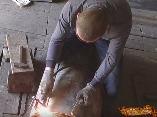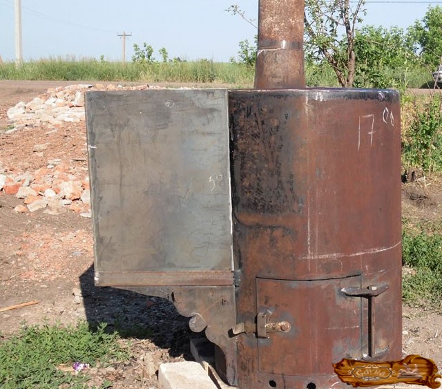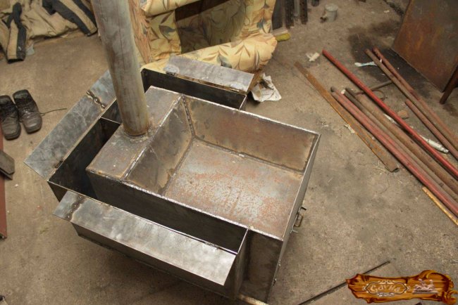 Дно водного бака вставляется в дымовую трубу и заваривается немного выше вместилища для камней. Труба для дыма должна оказаться сбоку от участка в виде совка.