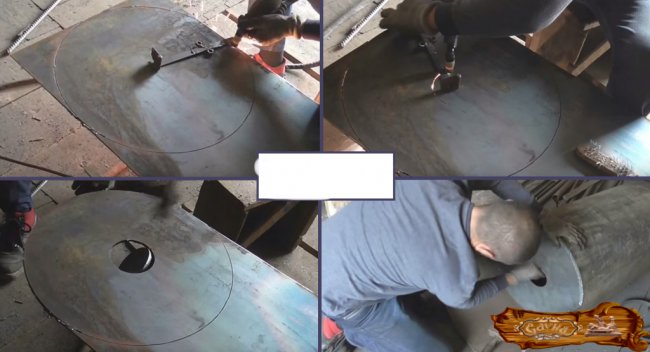 Дно вырезается из листа стали в соответствии с диаметром внутренней части трубы, далее на нем вырезается отверстие в виде круга диаметром от 30 до 50 мм, которое станет впоследствии станет дымоходом.