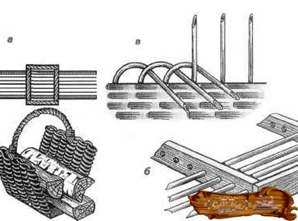 На двух сторонах, в вертикальных деревянных заготовках, расположенных напротив друг друга, через 30 мм высверливают отверстия, куда продевают иву и сплетают боковину, проходя через проволоку, сначала с левой стороны, потом с правой.