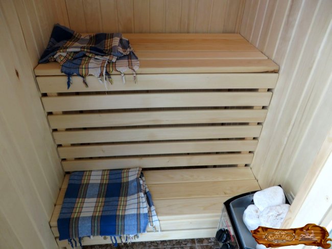 В зависимости от того, какой тип сауны вы выбираете (угловая или пристенная), важно рационально распланировать расположение сидений и печки. Компактная парилка на балконе обычно рассчитана на 2 человек, и полок будет небольшим – по ширине балкона. Для сооружения 2 ярусов брусья крепятся к полу и между собою, а затем создаются места для сидения с минимальным расстоянием между ними – 50 см.