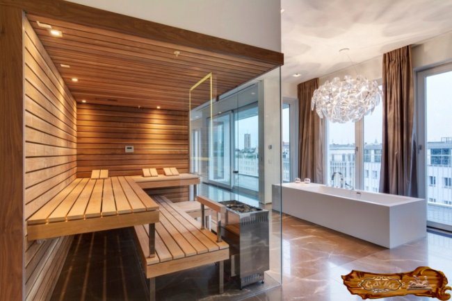 Сауна в городской квартире – это миниатюрная парилка, выполненная по всем канонам парной, но отапливается за счет электричества. Здесь не требуется установки дымохода, все помещение занимают только лавки. В непосредственной близости располагают штангу душа. Весь комплекс занимает не более пары метров площади. Материал для отделки сауны в квартире выбирают легкий, чтобы не менялась нагрузка на несущие конструкции дома. Высокие требования предъявляются к экологическим показателям – на маленькой площади проще позволить себе отделку липой или кедром, которые считаются лучшими сортами древесины для саун.