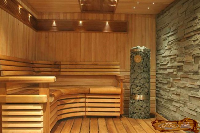 Облицовочный натуральный камень или кирпич добавят солидности сауне. Сочетание камня и дерева считается классическим. Печь-каменка и некоторые простенки парного и помывочного отделения, выполненные из камня или кирпича, имеют благородный внешний вид. Камень – самый долговечный материал, он не горит, не деформируется от воды. Для комнаты отдыха можно использовать искусственный камень, по своим эстетическим качествам и эксплуатационным характеристикам он не уступает натуральному аналогу, а иногда превосходит его.