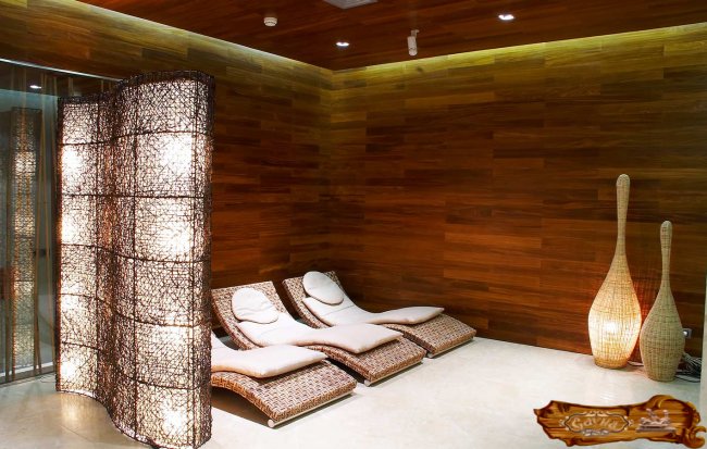 Сосна – самый доступный материал на отечественном рынке, имеет небольшую устойчивость к влаге. Смолы при нагревании образуют некрасивые потеки на поверхности древесины. Этот материал лучше применить в оформлении комнаты отдыха. Деревянные отделочные материалы выпускаются в виде вагонки с различными профилями.