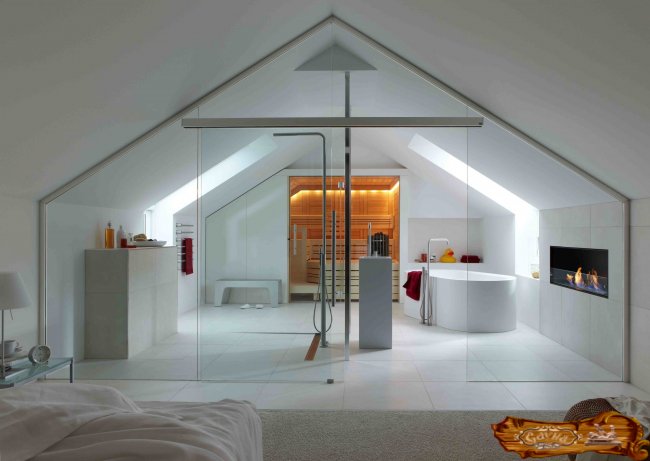 Открытое пространство лофта не делится на отдельные комнаты. Стеклянные перегородки условно разделяют сауну, ванную комнату и спальню. Технологичность всех компонентов и ультра-современное оснащение придают футуристические черты всему интерьеру. Сауна, расположенная в дальней части комнаты, становится элементом обстановки. Это подчеркивает ее удобство для регулярного использования.