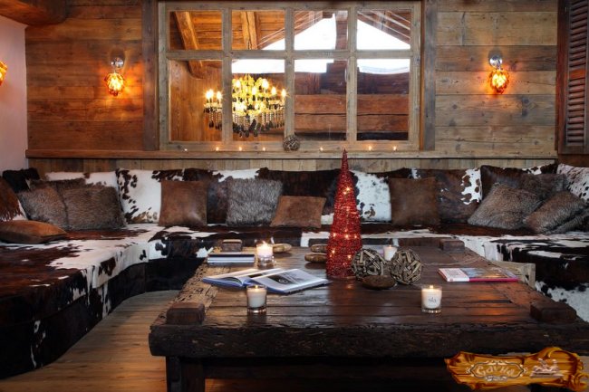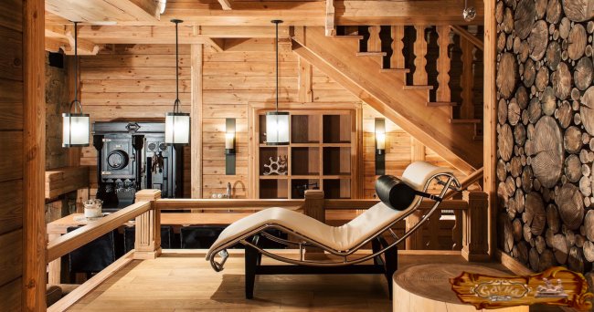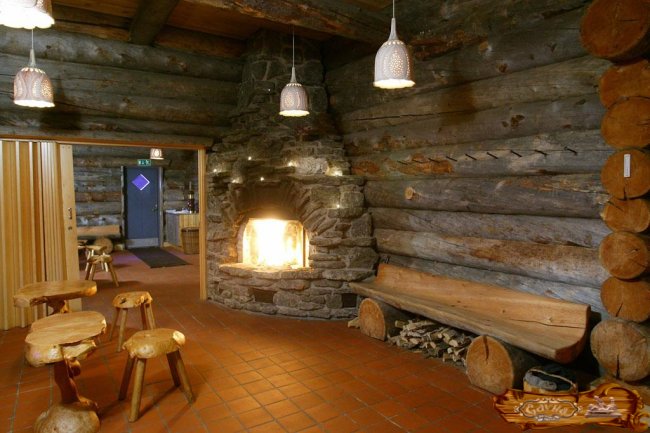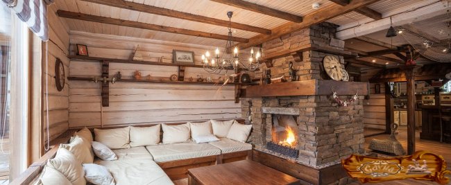 Популярной вариант отделки – в стиле шале. Комната отдыха должна иметь большие окна с красивым пейзажем. Стены облицовываются материалами из натурального дерева или штукатурятся и окрашиваются в однотонный светлый колер, декорируются охотничьими трофеями или картинами со сценами охоты. Пол выполняют из шпунтованной доски или керамической гранитной плитки. Топку печки оформляют в виде камина и выводят в комнату отдыха.