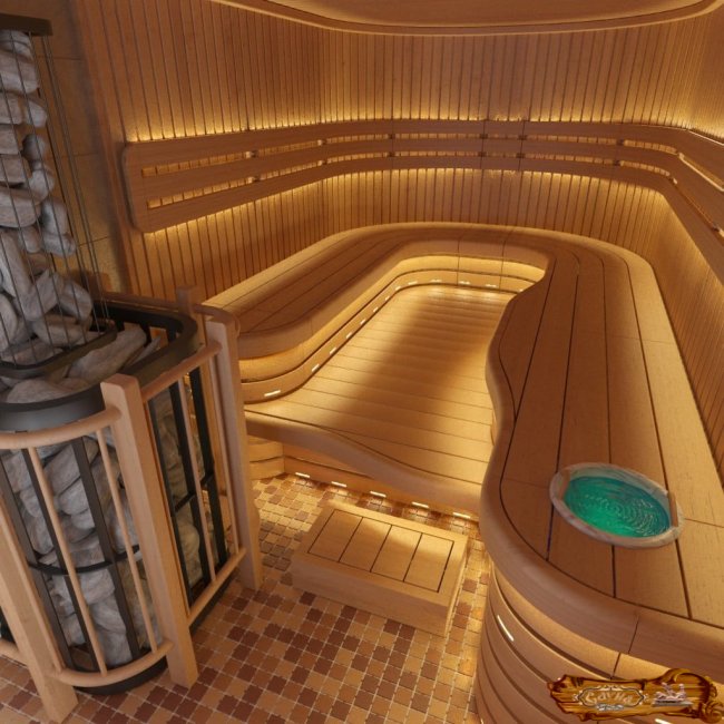 Просторные сауны в частном доме имеют несколько комнат, каждую из которых можно оформить в определенном стиле. Парную внутри можно оформить в стиле хай-тек. Светодиодная цветная подсветка придаст интерьеру футуристические черты. Плавные линии лавок необычно моделируют пространство. Простота декора компенсируется концепцией подсветки и изогнутости стен.