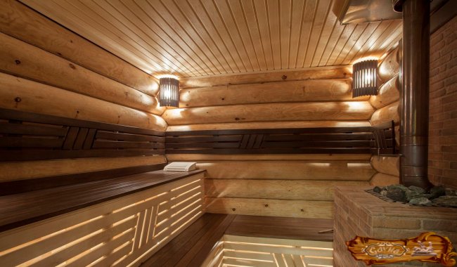 При всех преимуществах квартирной сауны ничто не сравнится с баней в загородном доме. Здесь можно дать простор своему воображению и декорировать домик по своему вкусу. Маленькая банька из круглого бревна предполагает оформление в традиционном сельском стиле. Небольшие окна с деревянными наличниками, полати из широкой цельной столешницы, печка из кирпича придадут сельского шарма. Для создания сухого пара парилку делают изолированной с прочной деревянной дверью, помывочная занимает среднее помещение, входную зону образует раздевалка, совмещенная с комнатой отдыха.