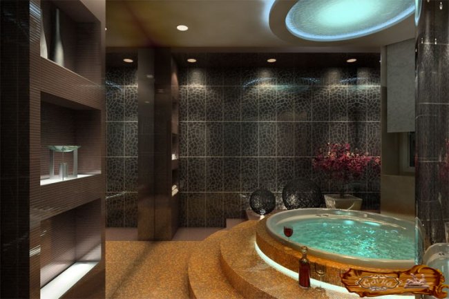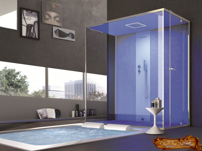 Душевая – самое уязвимое с точки зрения влагостойкости помещение, поэтому здесь оптимальным будет применение плитки, камня, стекла, металла. Популярным стало оборудование в душевой бассейна. Он традиционно отделывается плиткой. В душевой большую роль играет организация освещения для декорирования пространства. Мягкий свет на многоуровневом потолке имитирует отражение воды, создавая эффект глубины.