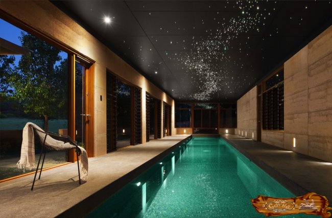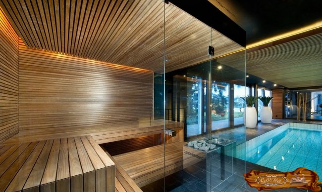 Поможет принять решение по отделке собственной сауны изучение рекомендаций профессиональных дизайнеров и лучшие примеры оформления сауны. Вид бассейна с подсветкой в стиле хай-тек изнутри парного отделения создает футуристическую панораму.